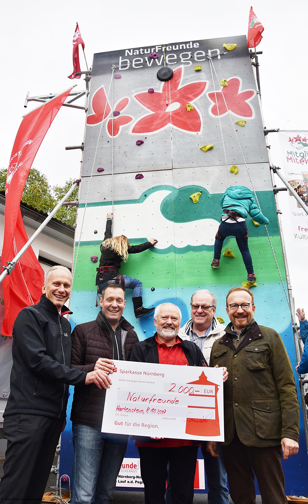 Als einer von bundesweit 19 Aktionstagen der Kampagne „NaturFreunde bewegen“ fand im Oktober der „Tag der Regionen“ des Fachbereichs Natursport der mittelfränkischen NaturFreunde statt. Fünf regionale Ortsgruppen präsentierten sich und die neue mobile Kletterwand konnte ausprobiert werden. Die Sparkasse Nürnberg nutzte die Aufmerksamkeit, um öffentlichkeitswirksam einen Förder-Scheck über 2.000 Euro an die mittelfränkischen NaturFreunde zu übergeben. „Wir kennen die NaturFreunde schon lange und fördern gerne soziales Engagement im Jugendbereich. Da bot sich der gut besuchte Tag der Regionen an“, so Otfried Bürger von der Sparkasse Nürnberg.