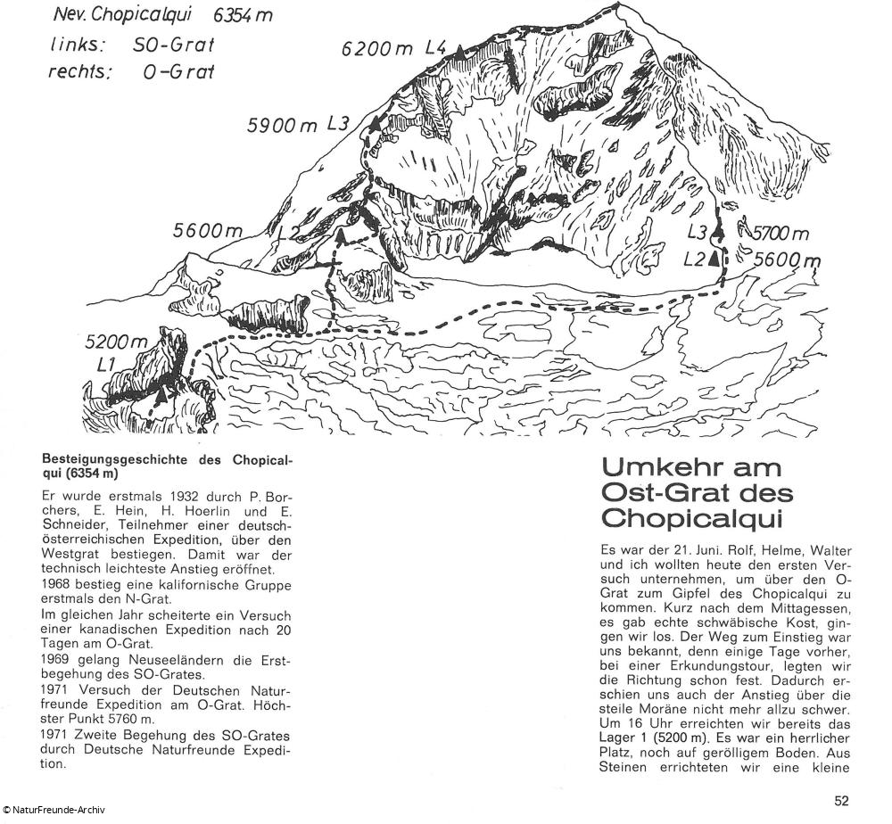 Als etwa die Besteigung des 6.354 Meter hohen Chopicalqui über den Ostgrat abgebrochen werden musste, notiert Wibmer: „Der Grat war in der Verlängerung so messerscharf und nach beiden Seiten meterweit überwächtet; an dieser Stelle weiterzugehen, käme Selbstmord gleich. Der Entschluss, nun umzukehren, fiel uns allen schwer.“