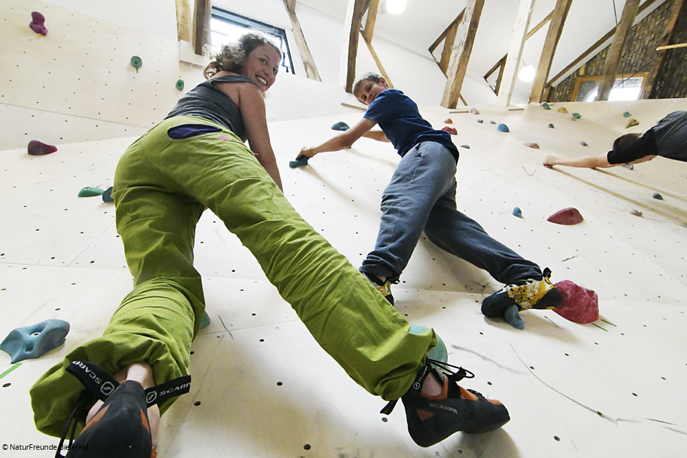 Bei der Finanzierung mitgeholfen hat die NRW-Stiftung. Sie gab 220.000 Euro als Förderung dazu. Für das Geld wurde unter anderem ein Treppenlift für Rollstuhlfahrer eingebaut. So können auch Körperbehinderte das neue Angebot der NaturFreunde nutzen. Das Haus ist damit barrierefrei. „Wir geben hier Kletterkurse. Und natürlich ist es dabei unser Ziel, dass mehr Menschen dem Verein beitreten“, sagt Gerd Weichynik. Die treffen dann auf das sehr breite Programm der NaturFreunde Bielefeld: Vorträge und Diskussionen zu Natur und Umwelt, Kanufahrten, Wanderungen, Skifreizeiten und vieles mehr. Wer Natur und Bewegung mag, ist bei den NaturFreunden Bielefeld richtig. Und wer gerne indoor bouldert, jetzt erst recht.