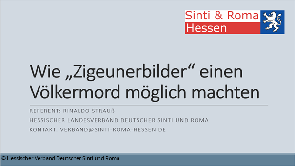 In seinem Vortrag mit dem Titel: „Wie 'Zigeuner'bilder einen Völkermord möglich machten“ befasste sich der stellvertretende Geschäftsführer des Hessischen Landesverbandes Deutscher Sinti und Roma mit der Problematik des „Z“-Wortes als Fremdzuschreibung, sowie der Verfolgung, Vertreibung und Vernichtung seiner Gruppe. Sein eigener Vater und seine Großeltern waren nach Auschwitz deportiert worden, der Vater überlebte. Seine Mutter war in einem Lager bei Frankfurt. Und das sei leider ein typisches Schicksal. Neben den sechs Millionen Juden wurden in der NS-Diktatur circa 500.000 Sinti und Roma ermordet. Doch dieser Teil des Völkermordes wurde jahrzehntelang nicht anerkannt.