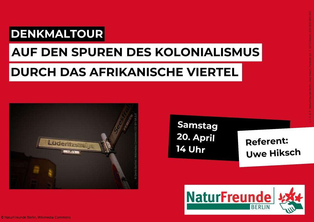 Die DenkMalTour führt auf den Spuren des Kolonialismus durch das Afrikanische Viertel. Sie stellt die Geschichte des Viertels von der Planung bis in die Neuzeit vor, zeigt Geschichte und Geschichten zu den Straßennamen im Viertel auf und stellt die Namensgeber der verschiedenen Straßen vor.