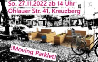 Die Initiative Expedition Metropolis/ Reichenberger Kiez für alle muss ihr Parklet wegen einer Baustelle temporär von der Straße auf den Gehweg verschieben. Dazu organisiert sie am Sonntag, 27.11. ab 14:00 vor der Ohlauer Str. 41 eine Aktion mit Suppe und Glühwein.
