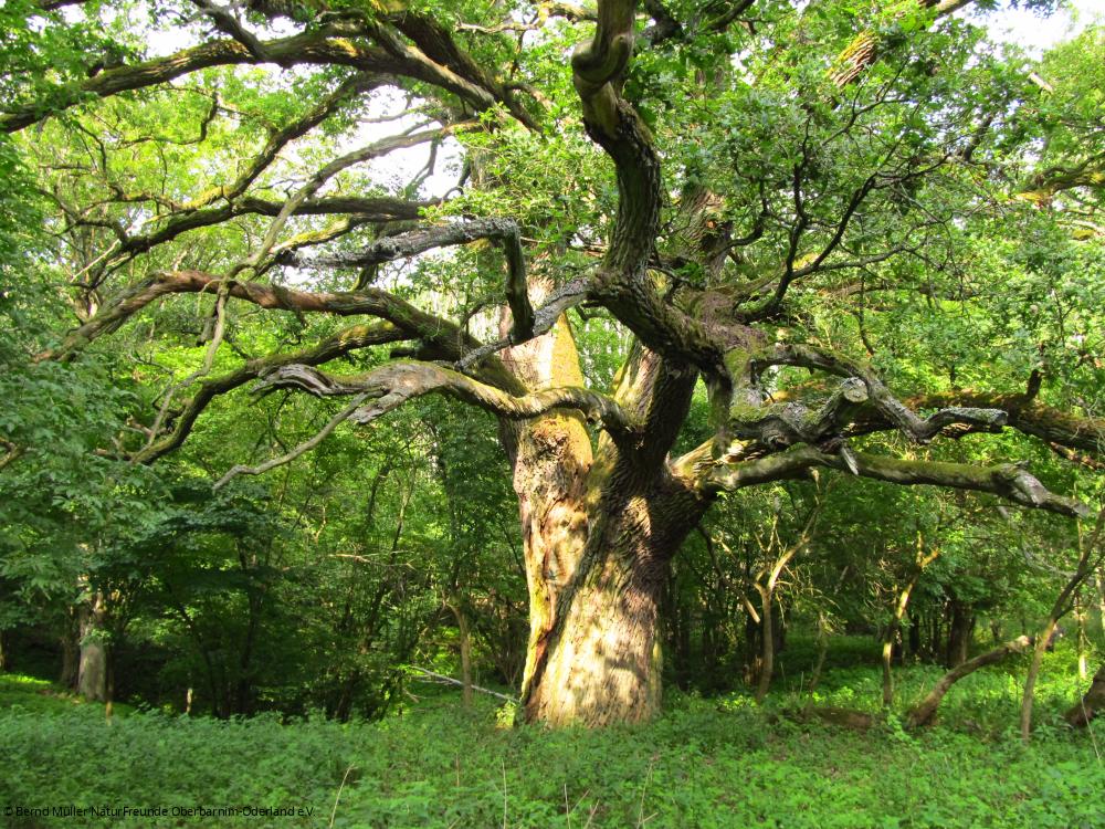 Die gemeinsame gemütliche 7 Kilometer Wanderung führt zuerst über die 860 Meter lange Europabrücke, welche die Oder und wunderschöne Oderauen überquert. Wir passieren auf einem befestigten Radweg den ehemaligen Bahnhof Zäckerick und die Eichhornmühle, eine Wassermühle der Müllerfamilie Zimmermann bis 1945. Dann kommen die Fischteiche in den Blick und wir verlassen den Radweg und kommen über einen wenige hundert Meter langen Feldweg zur Rieseneiche. Wirklich beeindruckend. Der Rückweg führt entlang am Wasserlauf auf einem schönen Waldweg zum Ausgangspunkt.
