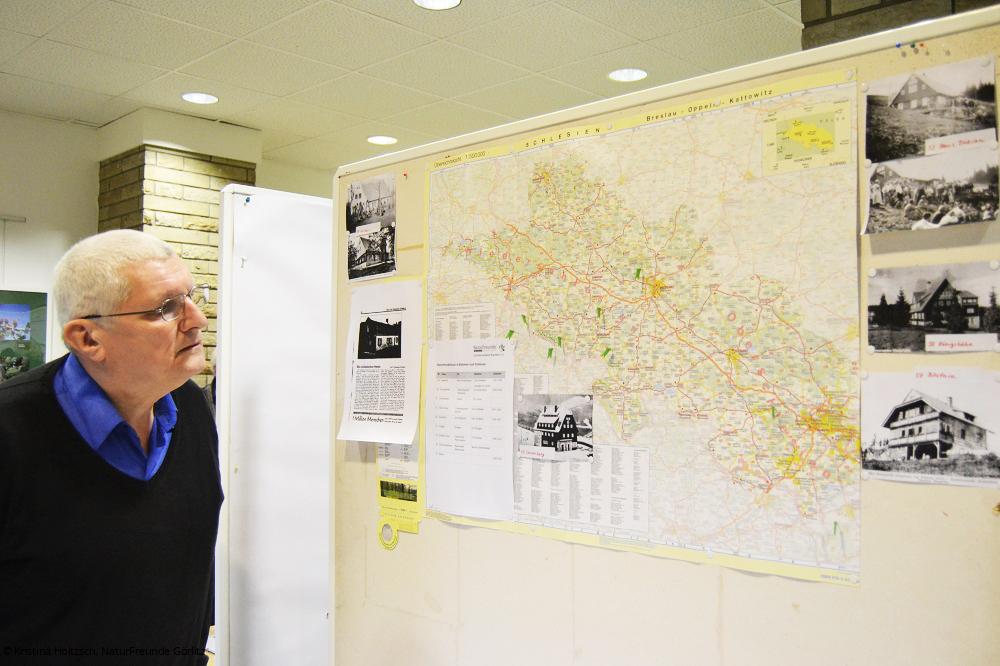 Eine Karte von Sachsen, Nordböhmen und Schlesien sorgte für großes Interesse. Die Karte war mit Fähnchen gespickt. Überall wo die Existenz eines Naturfreundehauses nachweisbar war, steckte ein solches. Zu den meisten Häusern gab es zumindest ein Foto. Vom kleinen Bootshaus bis zum großen Ferienheim war alles vertreten. Und eines wurde durch die Darstellung besonders deutlich. Ein dichtes Häusernetz spannte sich in den 30er-Jahren vom Vogtland über das Erzgebirge, Elbsandsteingebirge, Lausitzer Bergland bis ins Iser- und Riesengebirge beiderseits der Grenze.
