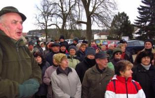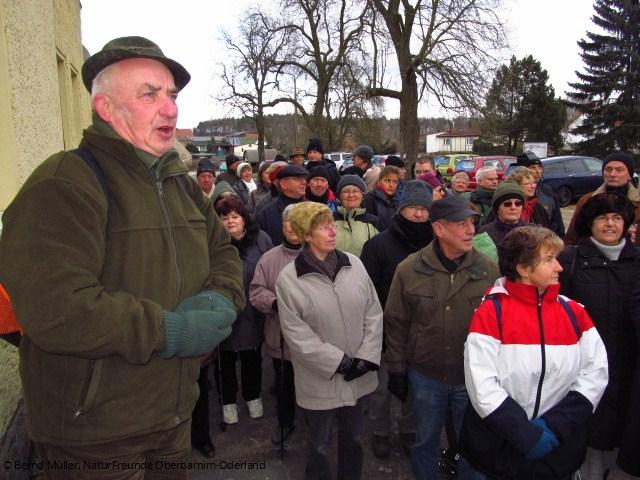 Altförster Gottfried Lehmann führt auf einem Spaziergang durch Harnekop und erzählt über Park und Wald des ehemaligen Schloss Monchoix sowie über den Generalfeldmarschall von Haeseler.